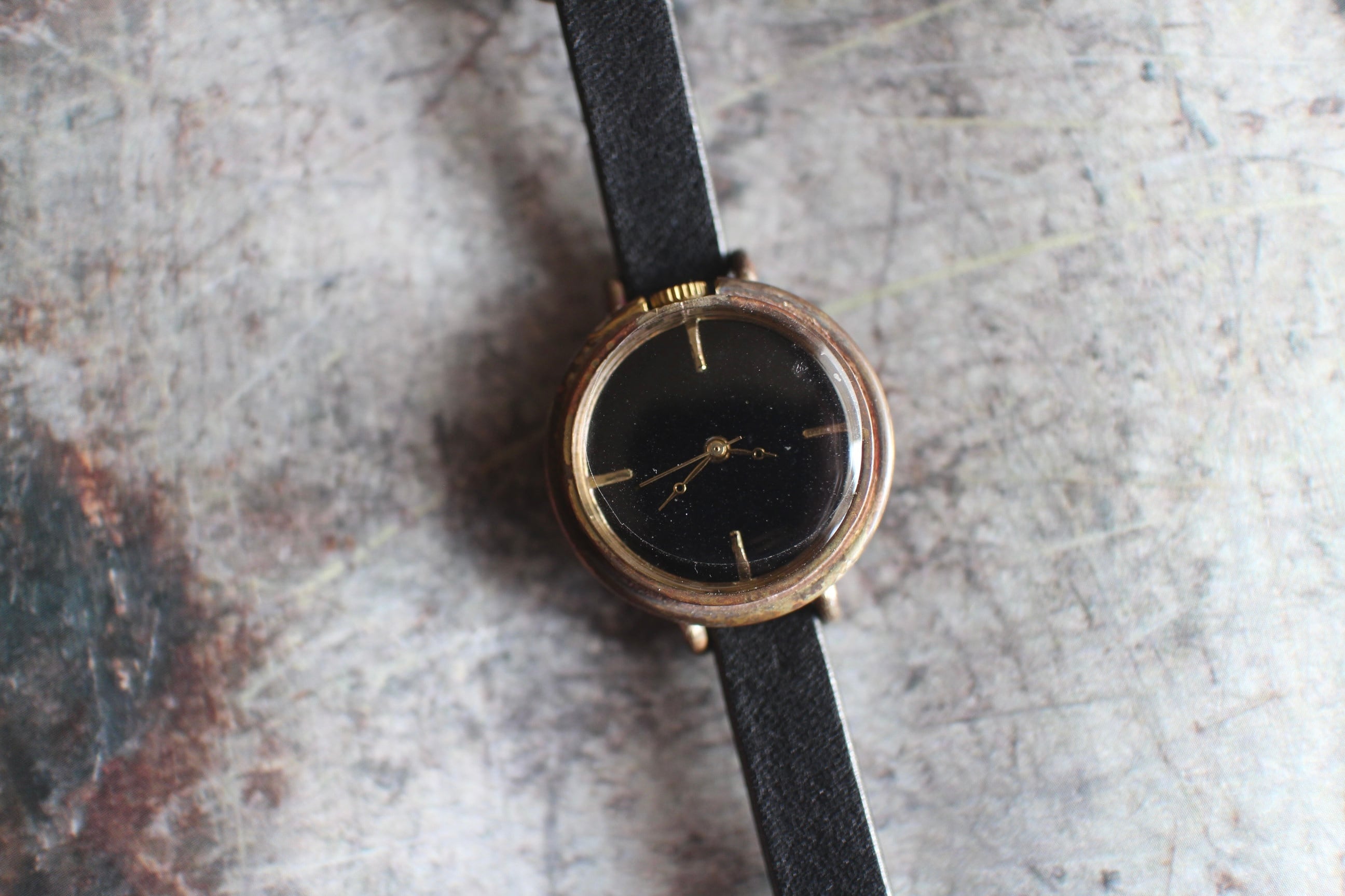黒い文字盤に真鍮の刻みを四つ付けた