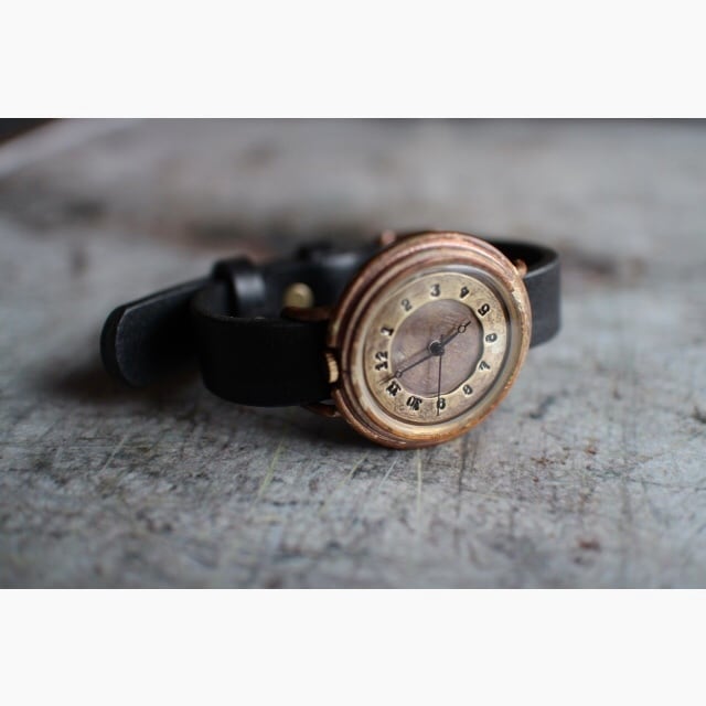 真鍮の文字盤に一つ一つ数字を刻印した腕時計です。リュウズは12時の位置にありポイントになっています。真鍮で使い込むほどに味の出てくる時計です。