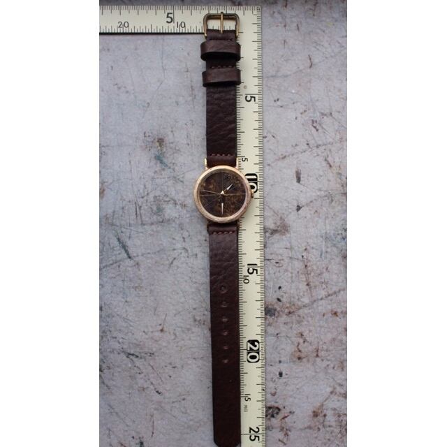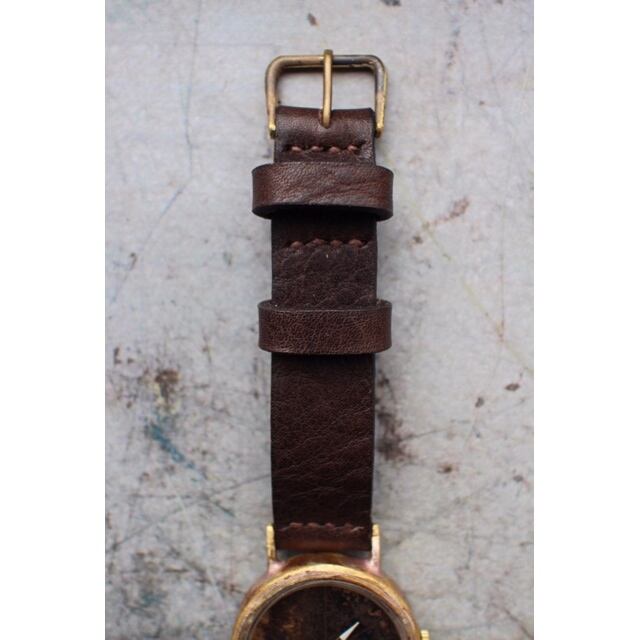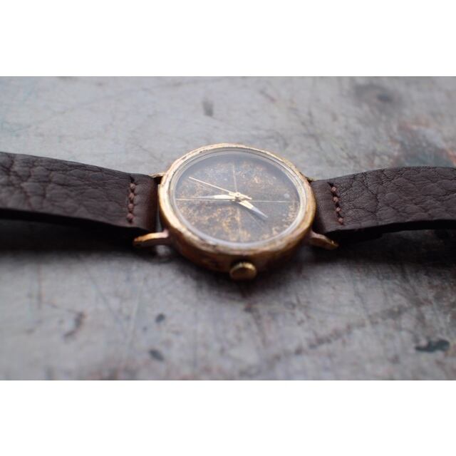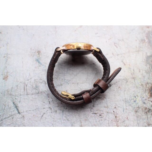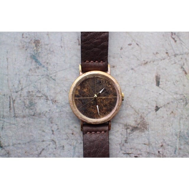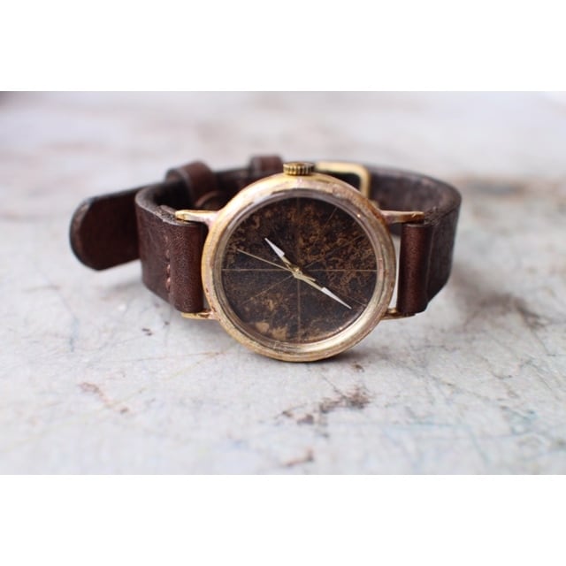 文字盤を焦がし線を入れたシンプルな文字盤です。針は金色の針の先に白い塗料を塗り見やすくしています。ベルトは手縫いベルトで仕上げています。使い込むほどに味の出てくる時計です。
