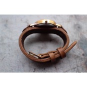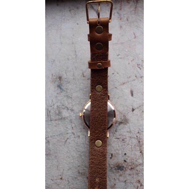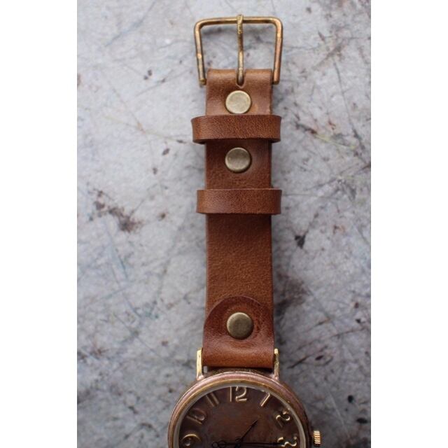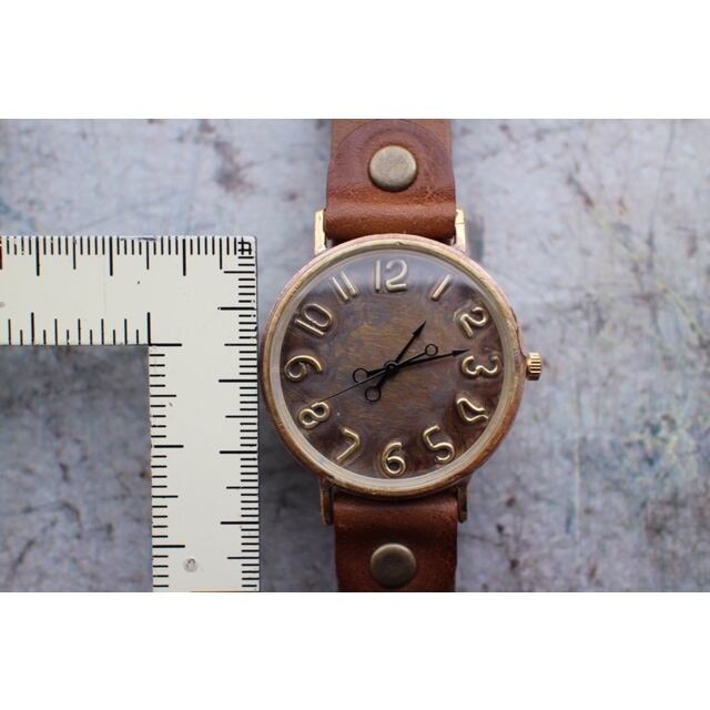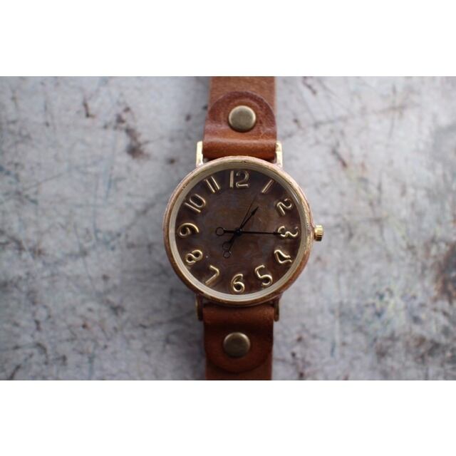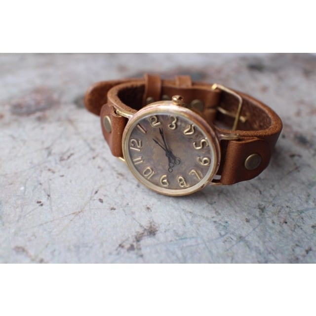 真鍮の文字盤に数字をろう付けした腕時計です。数字は細い真鍮線を曲げて手作りしています。ケースも真鍮で使い込むほどに味の出てくる時計です。