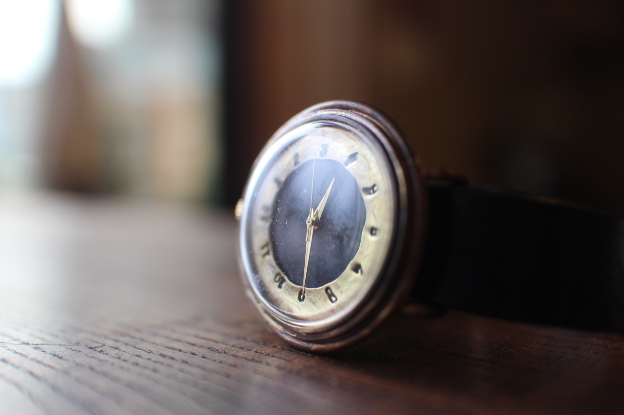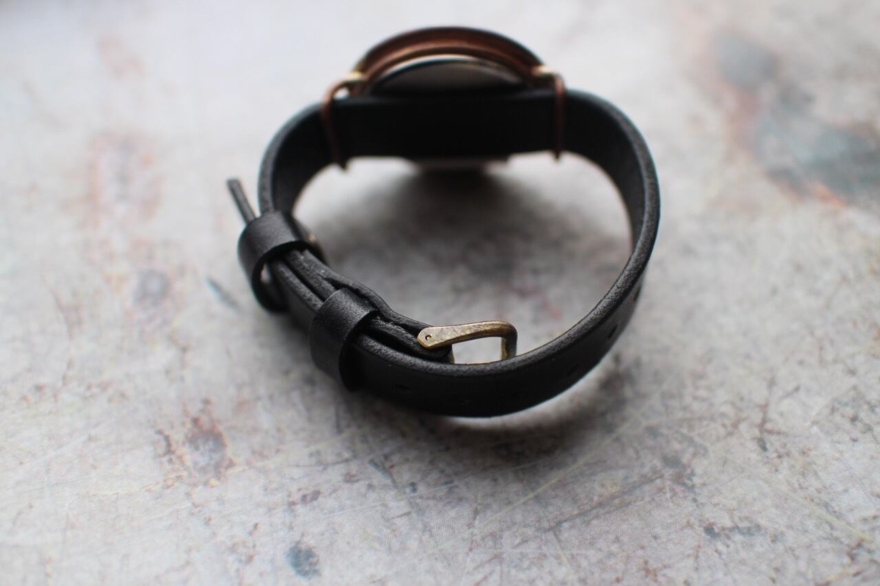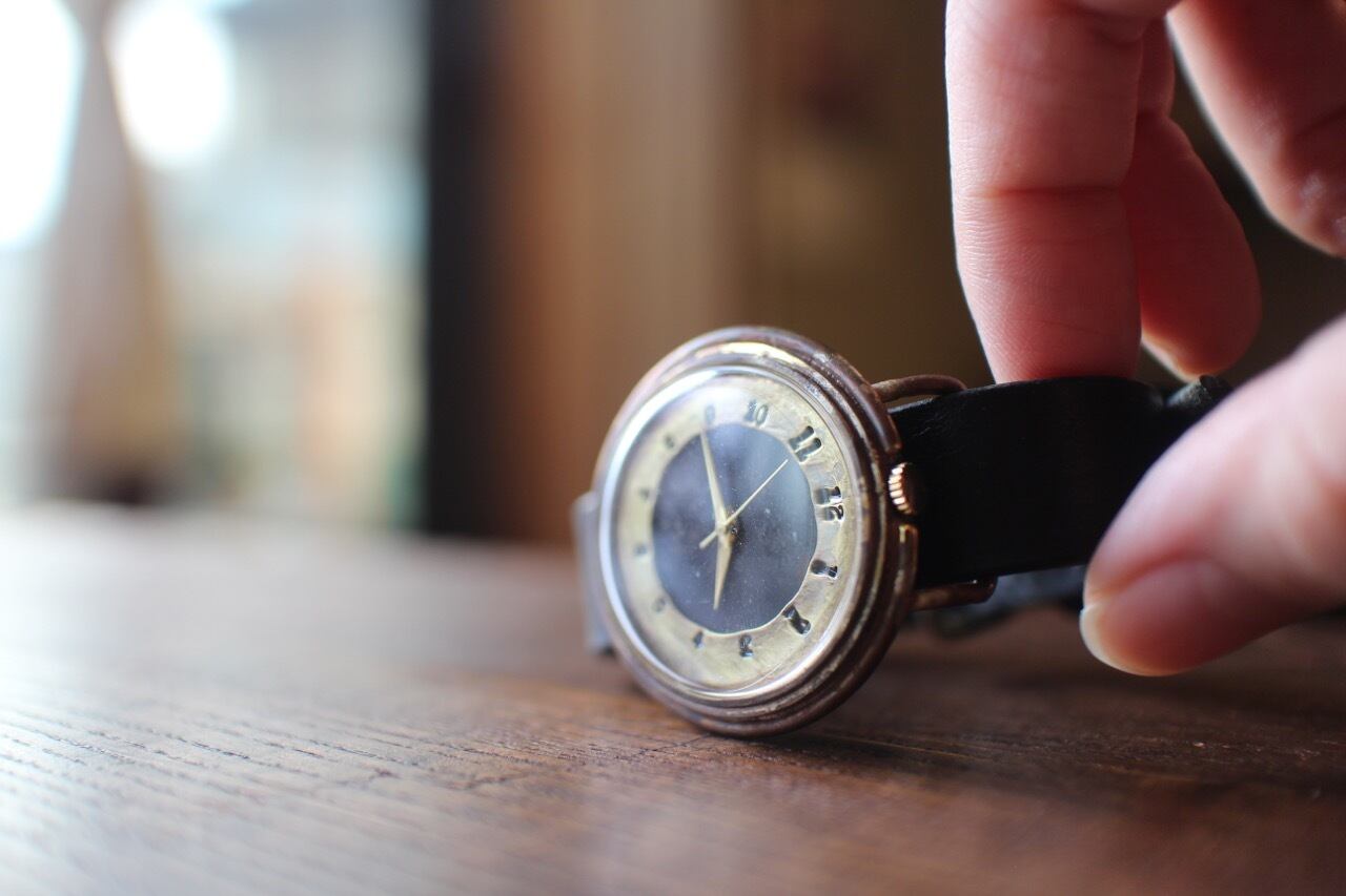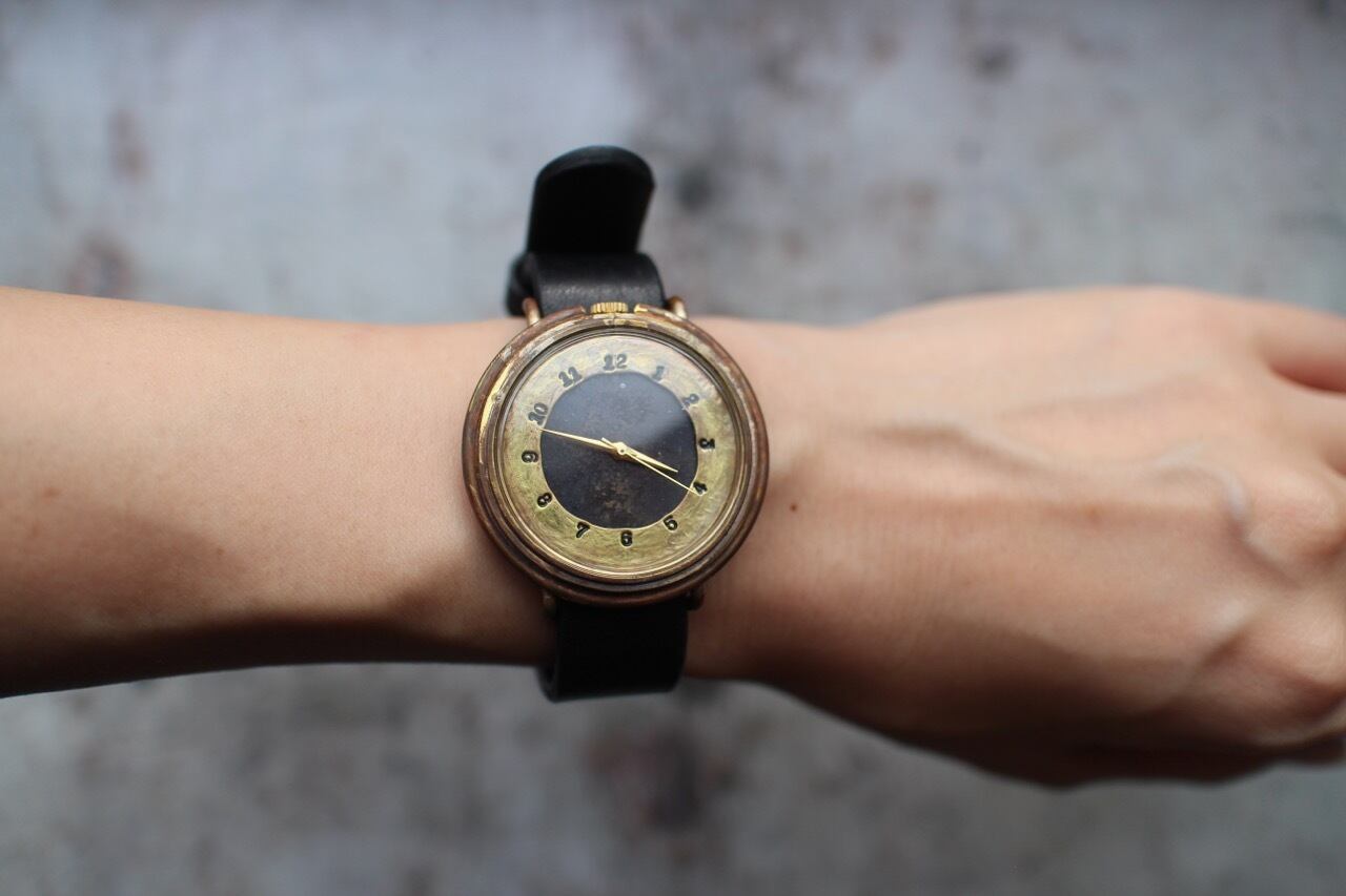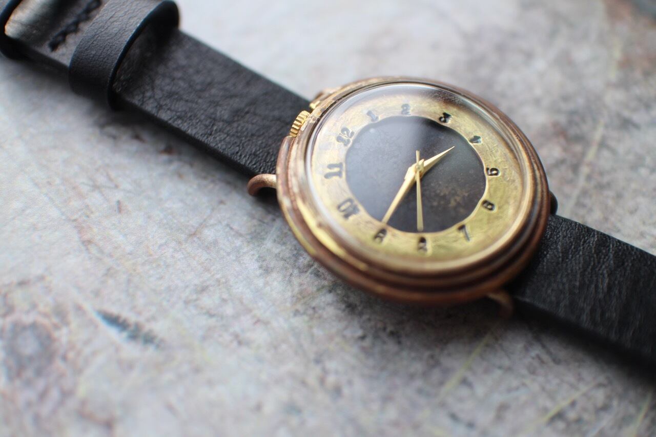 真鍮の文字盤に一つ一つ数字を刻印した腕時計です。リュウズは12時の位置にありポイントになっています。真鍮で使い込むほどに味の出てくる時計です。
