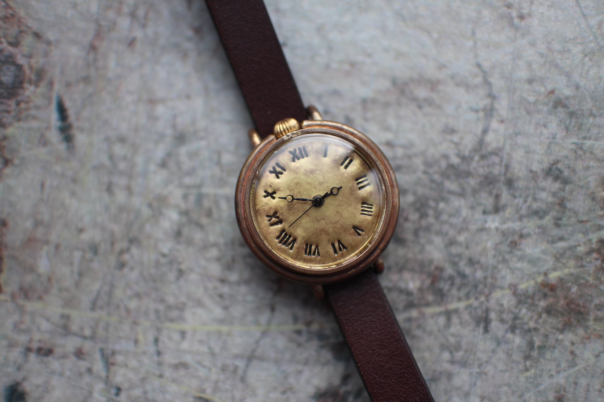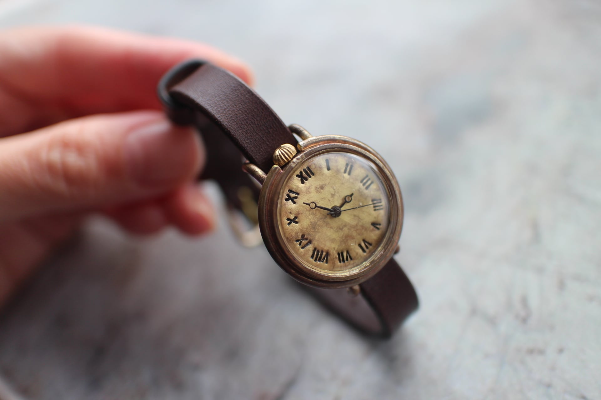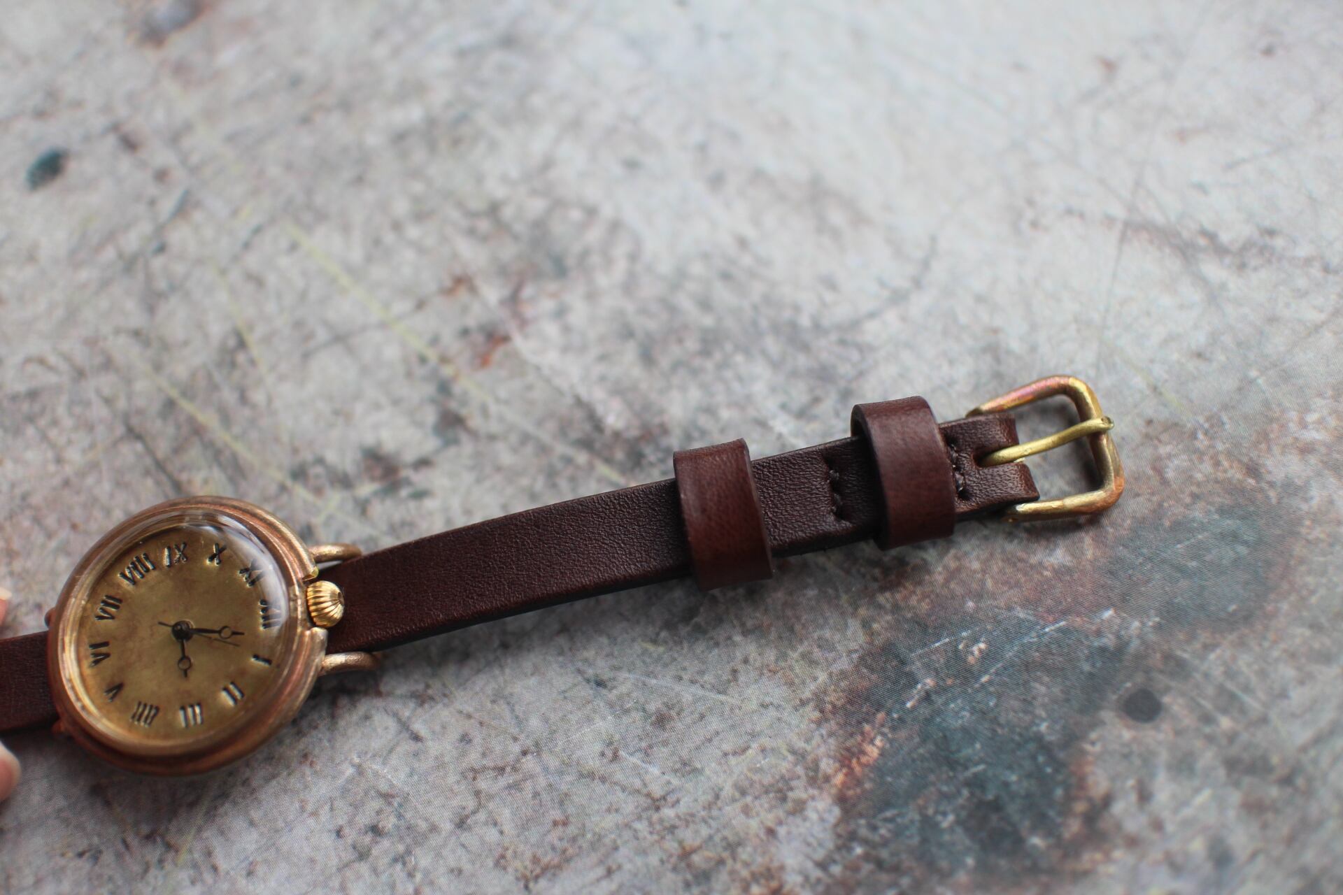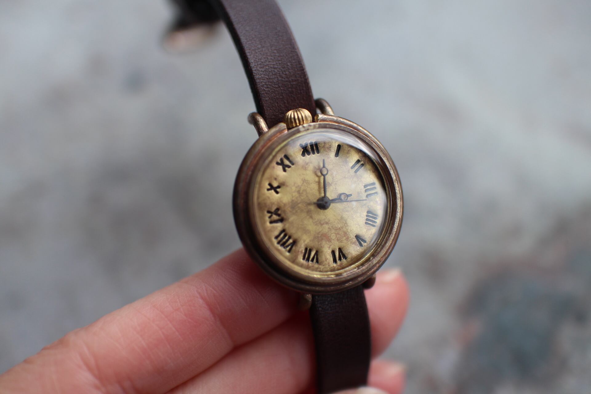 真鍮の刻印文字盤がシンプルでありながらも存在感を持ち、どんなスタイルにも合わせやすいです。